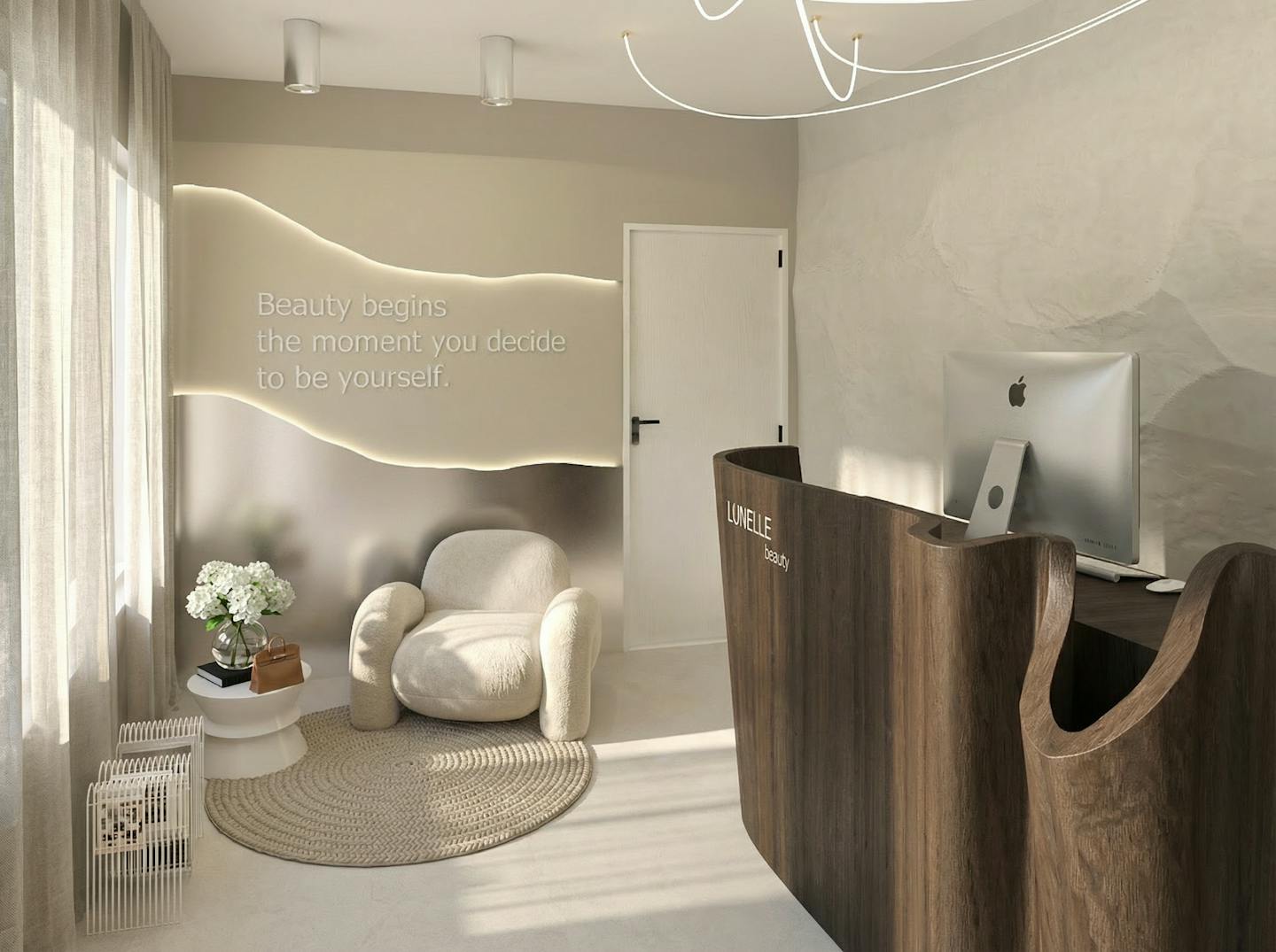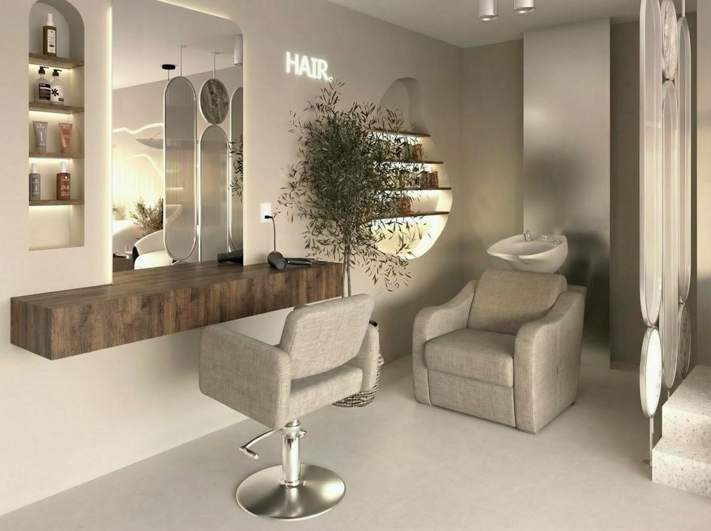 Das Design dieses Bauty Salons ist auf die Bedürfnisse moderner Haar-, Nagel- und Wimpernbehandlungen abgestimmt. Der Salon bietet eine ruhige, professionelle Umbegung, in der sich Kundinnen entspannen können.